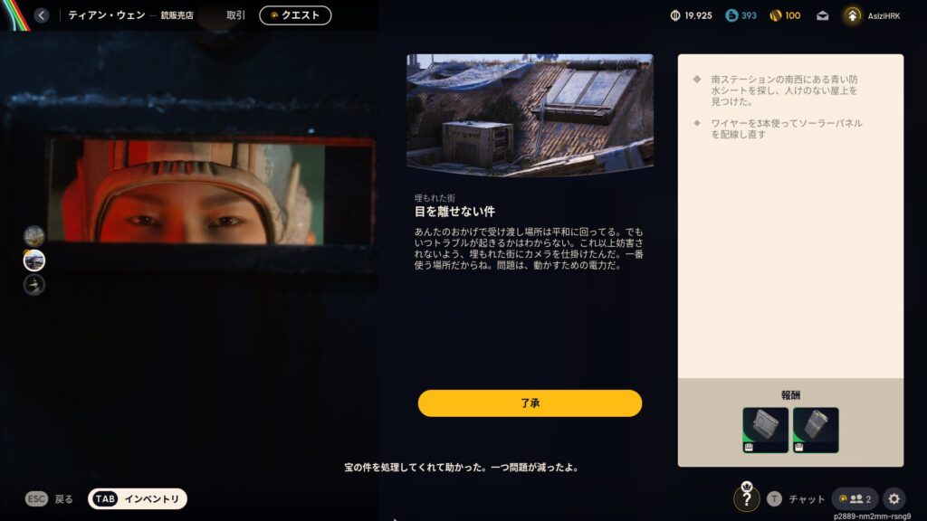 | クエスト説明 | あんたのおかげで受け渡し場所は平和に回ってる。でもいつトラブルが起きるかはわからない。これ以上妨害されないよう、埋もれた街にカメラを仕掛けたんだ。一番使う場所だからね。問題は、動かすための電力だ。 |