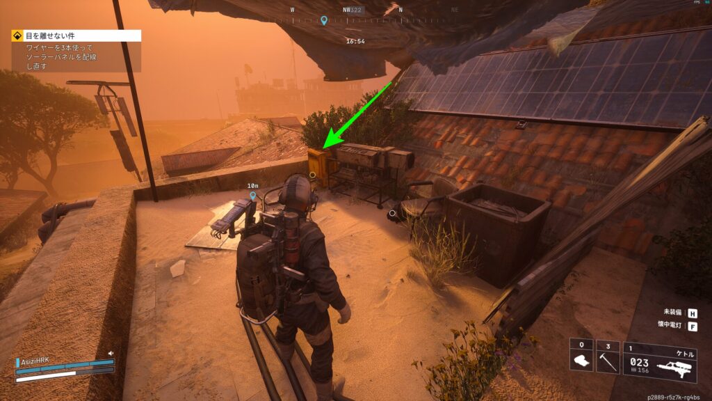 | タスクの内容 | ・南ステーションの南西にある青い防水シートを探し、人気のない屋上を見つけた。 ・ワイヤーを3本使ってソーラーパネルを配線し直す |