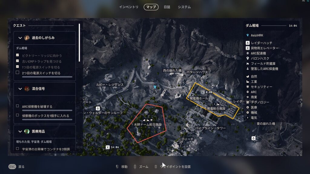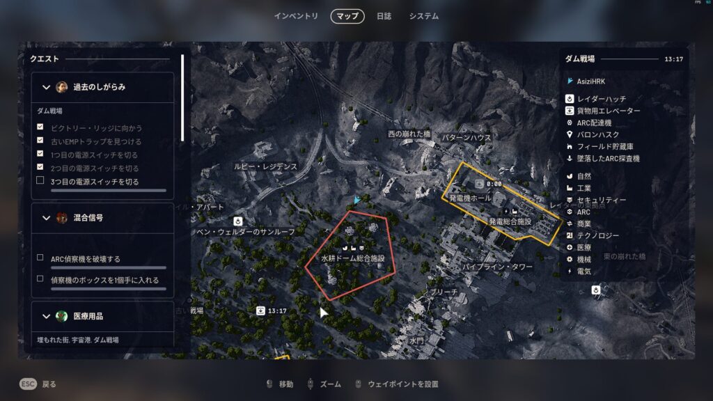 | クエスト説明 | ファーストウェーブの時代に、仲間とダムの近くにトラップを作った。発電機をオーバーロードさせ、ARC対策に使ったんだ。今も通信の遮断や奇襲のため、その罠が使われていると聞いた。レイダー同士の争いだ。終わらせるべきだ。 |