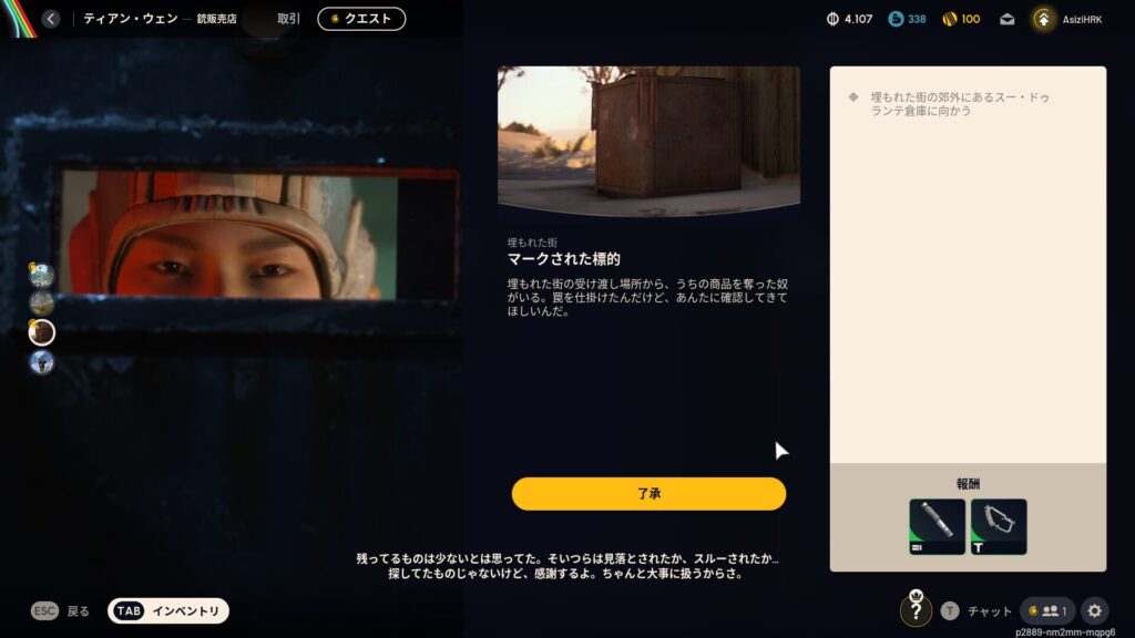 | クエスト説明 | 埋もれた街の受け渡し場所から、うちの商品を奪った奴がいる。罠を仕掛けたんだけど、あんたに確認してきてほしいんだ。 |