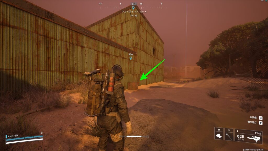 そのあと、コンテナや建物を向いて後ろの方向に木が生えている方向に行きます。