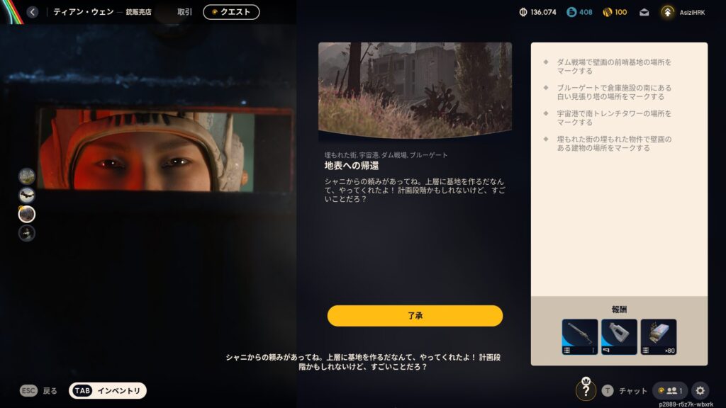 | クエスト説明 | シャニからの頼みがあってね。上層に基地を作るだなんて、やってくれたよ!計画段階かもしれないけど、すごいことだろ? |