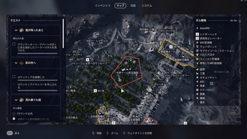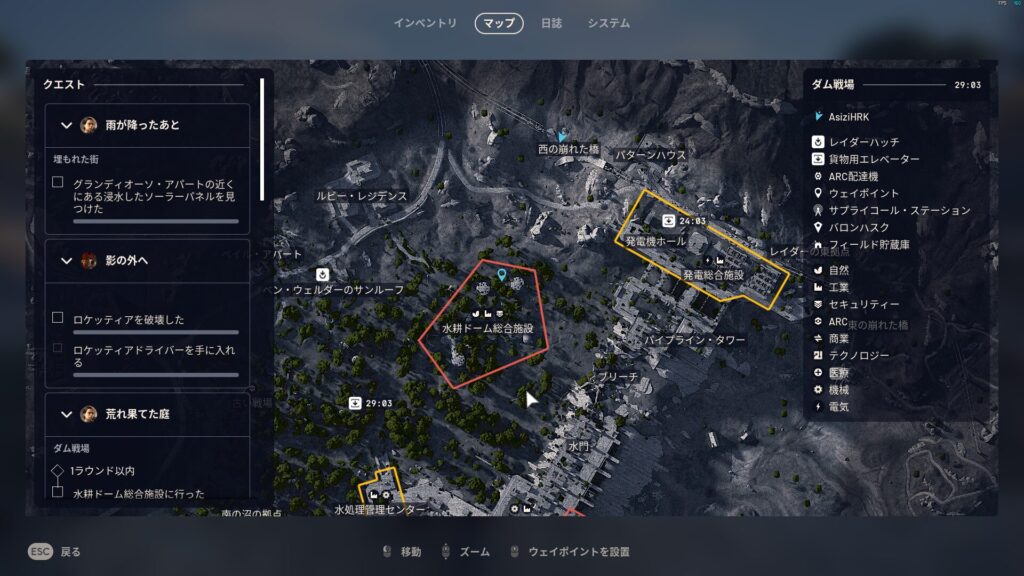 このクエストはダム戦場の水耕ドーム総合施設が目的地です。