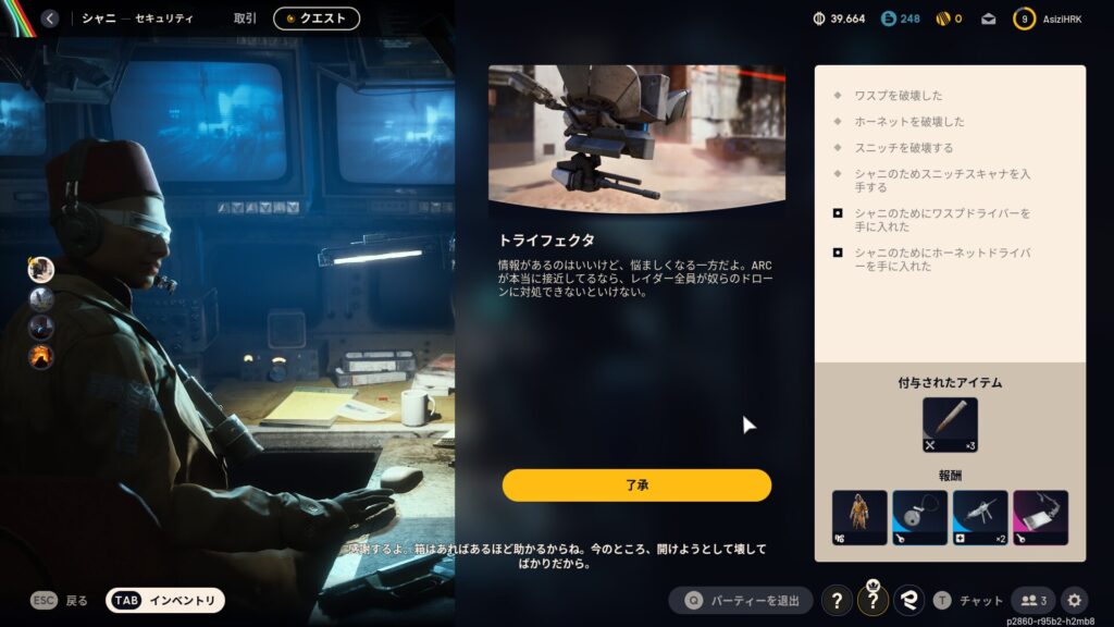 | クエスト説明 | 情報があるのはいいけど、悩ましくなる一方だよ。ARCがほんとに接近しているなら、レイダー全員が奴らのドローンに対処できないといけない。 |