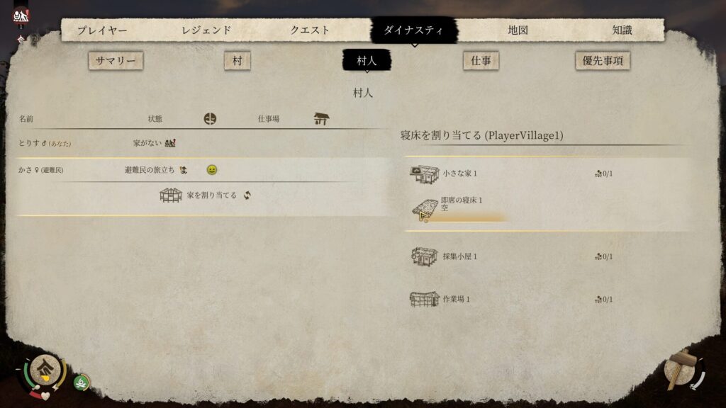 村人に寝床を割り当てるには、ダイナスティのところから村人を選択して家を割り当てるを選択。