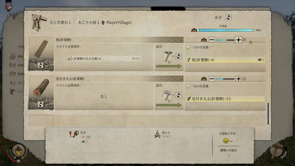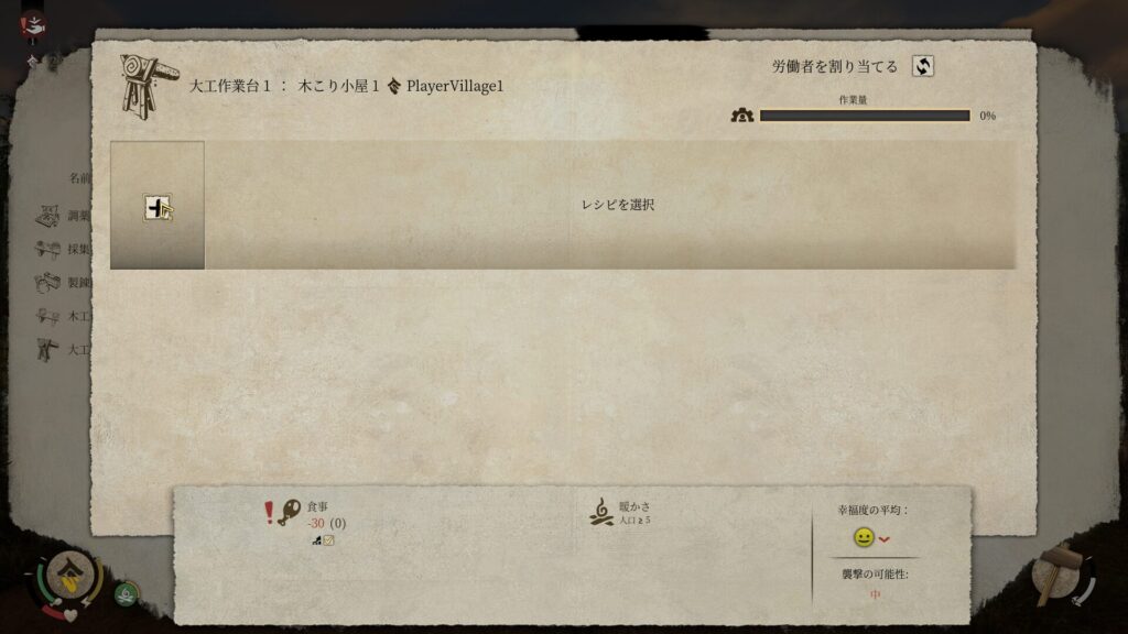 そのため、木こり小屋を建築して村人を割り当てることにした。