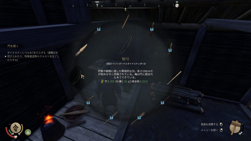 短弓のコストは竹1、縄1、板全般1となっていて縄が面倒だけど作れなくはない。