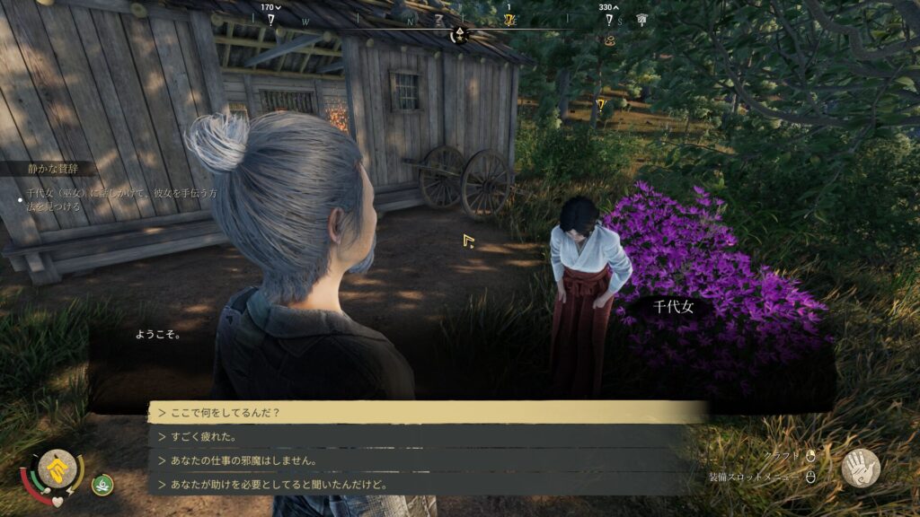 曽々木村から少し南下したところに居る巫女の姿の千代女に話しかけるとスタート。